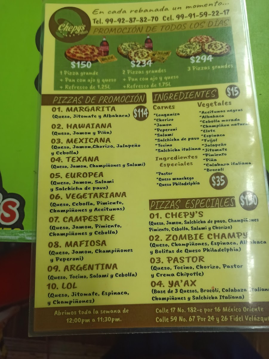 Introducing the menu at Chepy's pizza MÉXICO ORIENTE offers an enticing culinary experience nestled in Mérida. Their standout pizzas, like the classic Pepperoni Pizza with three cheeses, promise a delightful balance of flavors. The Pizza Junior, loaded with double pepperoni, is a customer favorite, perfect for those seeking robust taste.